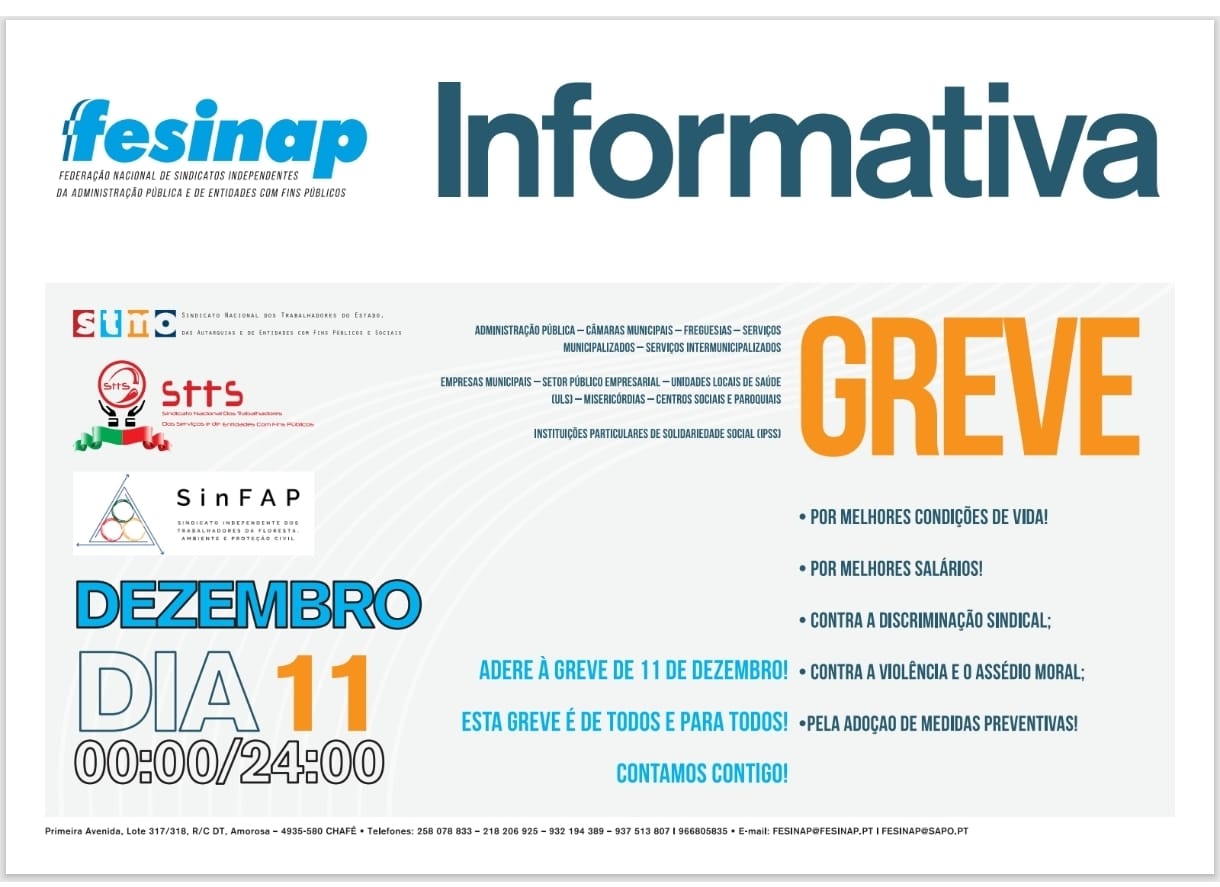 Assim, a FESINAP manifesta a sua Solidariedade a todos os trabalhadores, apelando a uma forte adesão à greve de 11 de dezembro!